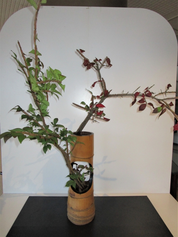 aa今週文化会館に活けられているお花は、ニシキギです。青々とした枝と紅葉した枝の2本が活けられています。