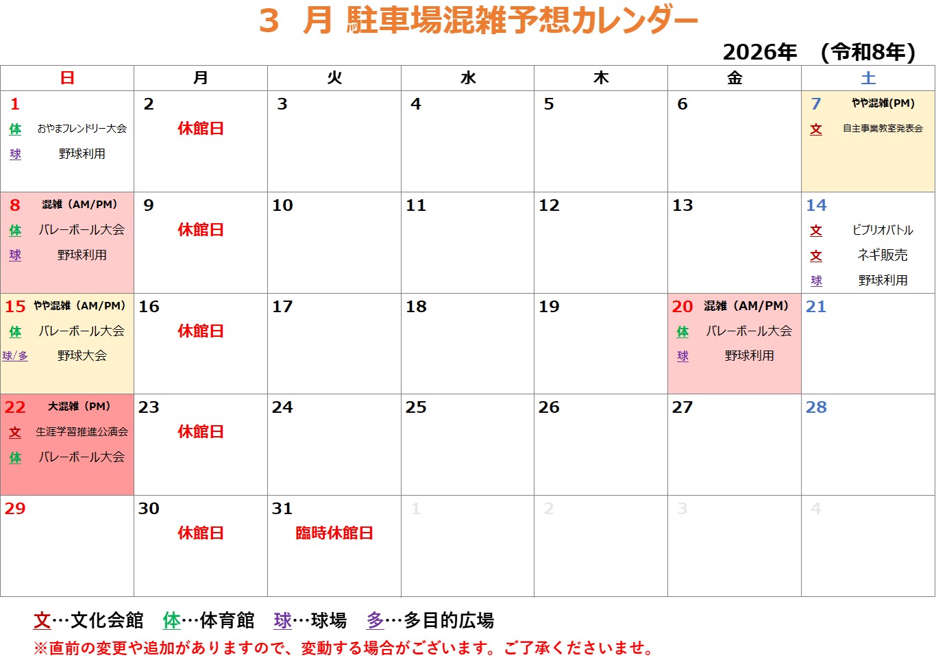 【2026年3月】駐車場混雑予想カレンダー