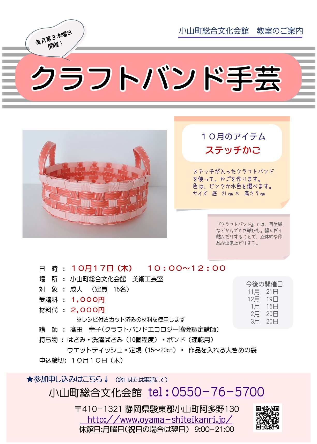 10月は、ステッチが入ったクラフトバンドを使って「ステッチかご」を作ります。